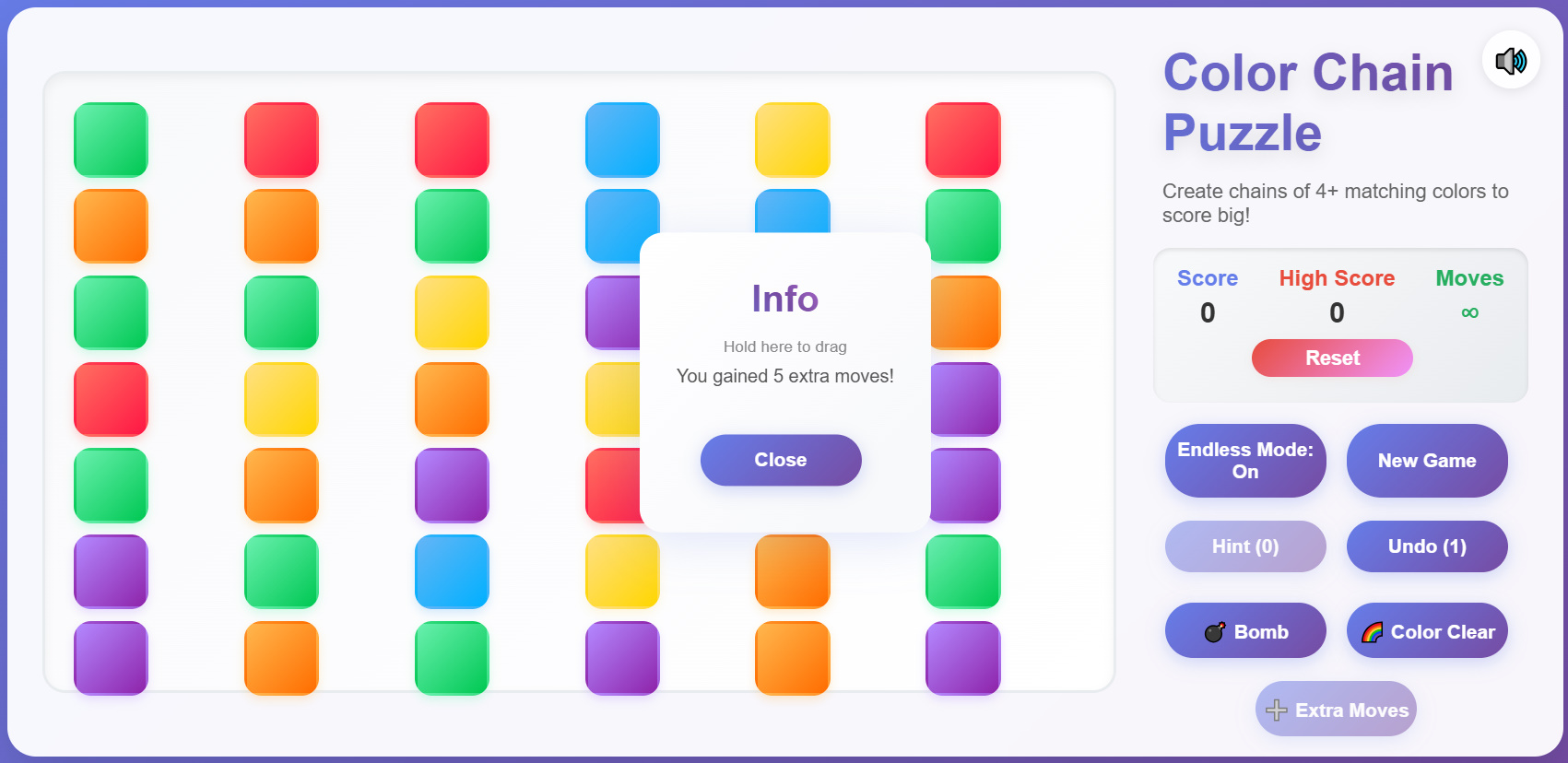 Swap adjacent cubes to create chains of 4 or more matching colors, clear the board, and rack up huge combos. Plan your moves, unleash powerful power-ups, and challenge yourself in both classic and endless modes.